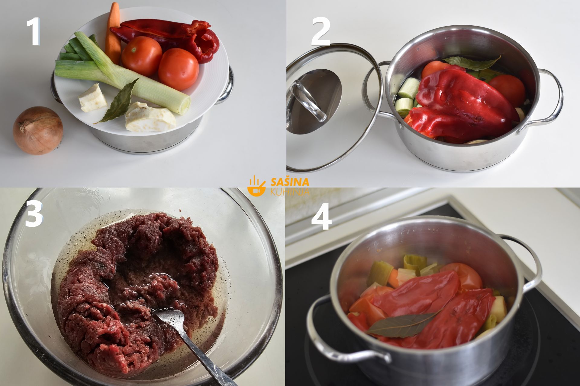 2. Rajčice i papriku prepolovite kako sam pokazao gore u videu a ostalo povrće krupno narežite i dodajte u lonac zajedno sa vodom i lovorom. Čim zakuha, nastavite kuhati oko pola sata