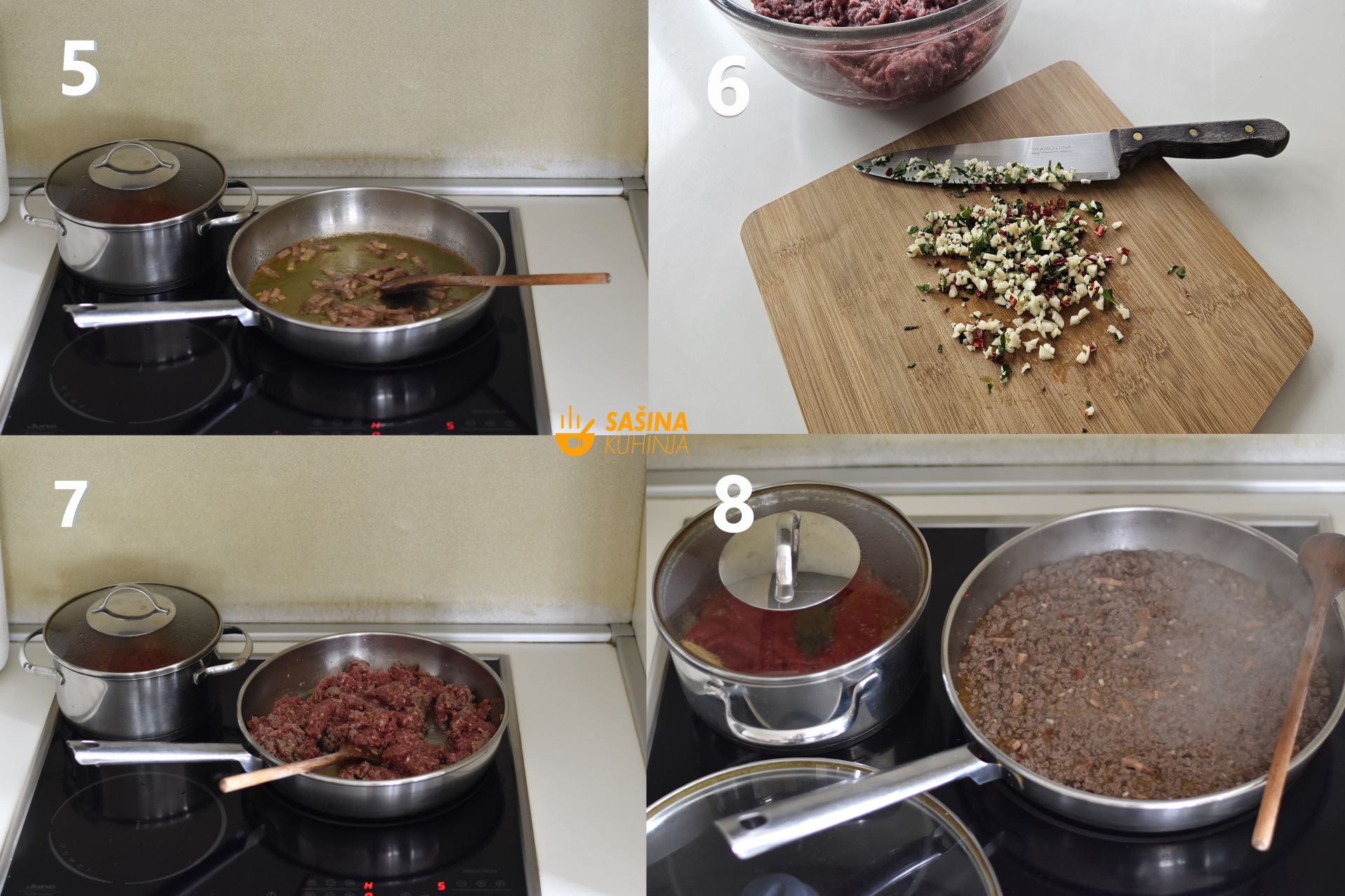 7. Dodajte u tavu i kratko promiješajte oko 15 sekundi pa dodajte faširano meso