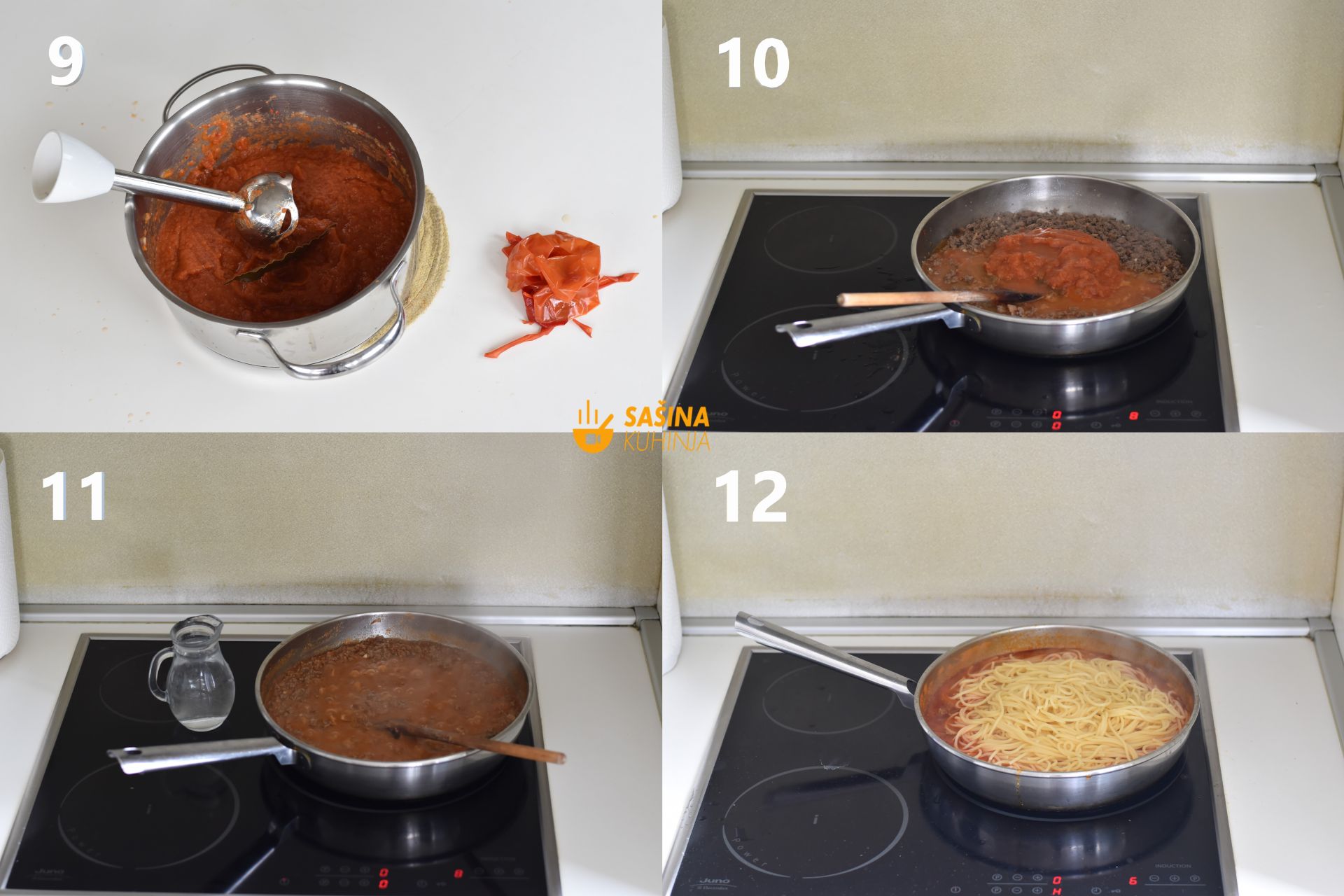 12. Nakon proteka vremena, ponovo zalite sa 2,5 dl vode a istovremeno stavite grijati vodu sa strane. Čim voda zakuha, posolite je i stavite kuhati Koleda špagete. SAVJET/VAŽNO: Ukupna količina umaka/sosa/safta je dostatna za 800g špageta. Upravo zbog toga sam odvojio polovicu umaka i spremio u duboko zamrzavanje za neki drugi dan. Naime, 400g Koleda špageta je sasvim dovoljno za ručak četveročlane obitelji. Špagete skuhajte al dente, pa dodajte u preostalu polovicu umaka 2,5 dl vode gdje se kuhala tjestenina. Kratko promiješajte, pa dodajte ocijeđene špagete