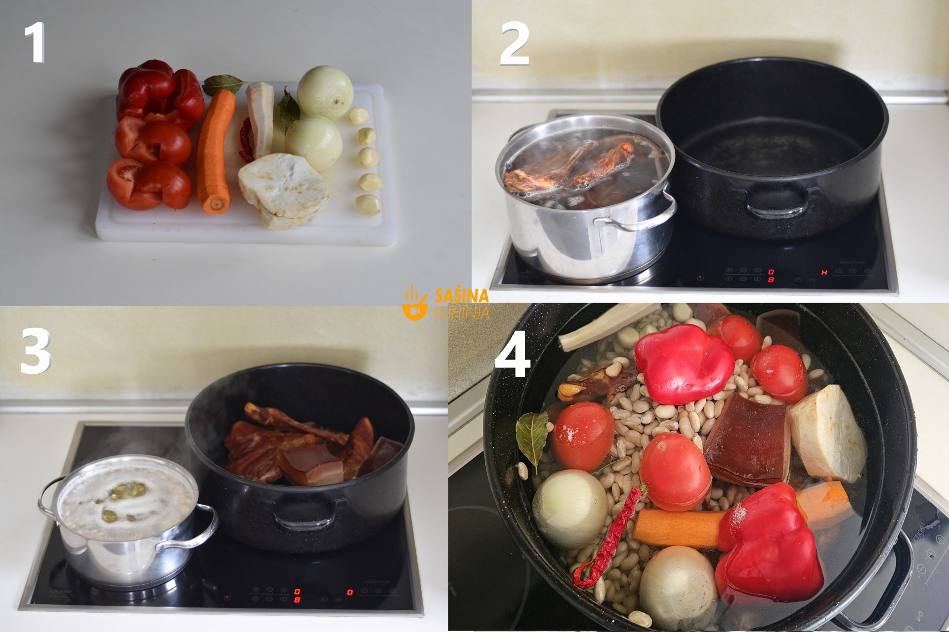 - Odmah uliti 4,5 litara vode i dodajte sol. SAVJET: Ako grah niste ostavili preko noći u vodi da nabubri, možda ne bi bilo loše dodati odmah čašu/dvije vode više, jer ćete jelo kuhati sigurno 20 minuta dulje dok grah ne omekša