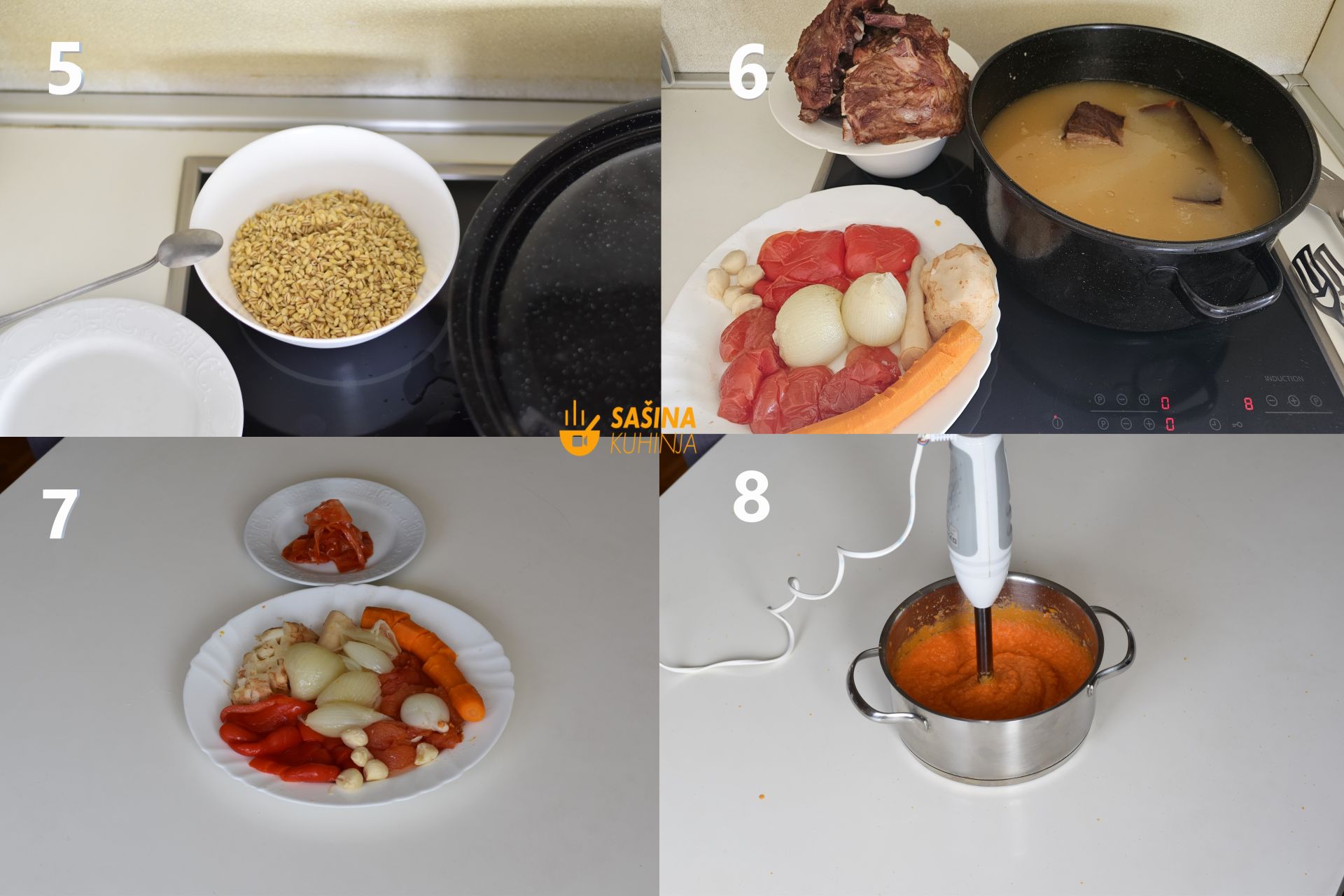 8. Krupno narežite povrće pa dodajte u neki manji lonac ili posudu. Sve pasirajte sa gnječilicom ili sa štapnim mikserom
