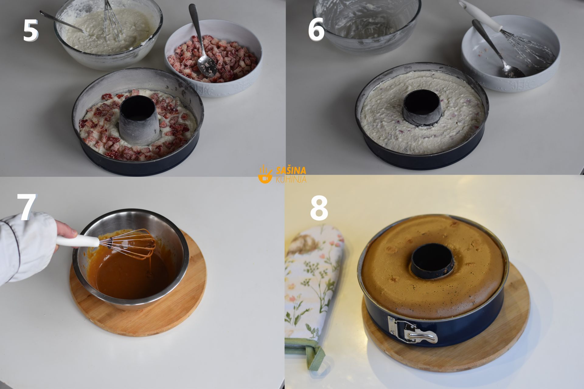 6. Ponavljati isti postupak slaganja naizmjence, trećinu preostale svjetle smjese, pa polovicu preostalih jagoda. Zatim drugu trećinu svjetle smjese, preostale jagode i preostalu trećinu svijetle smjese sa sirom