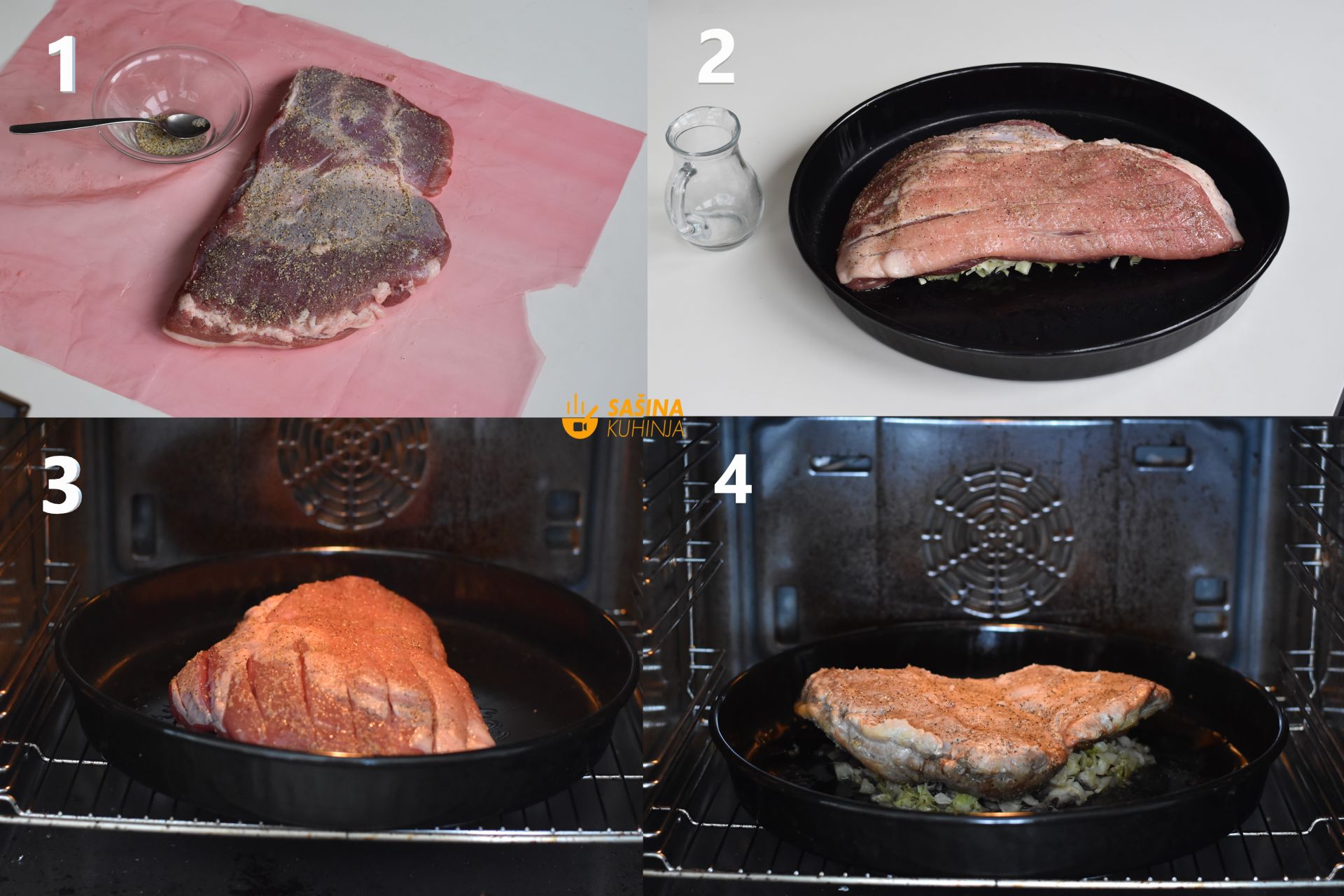 4. Nakon sat vremena okrenite meso i također skupite luk i kupus da bude ispod njega, ne smije “viriti” van da ne izgori i pocrni. Nastavite tako peći narednih sat vremena na istoj temperaturi. VAŽNO: Svaka pećnica drugačije peče, pa ako vidite da je npr. nakon 50 minuta gotovo, radije izvadite van