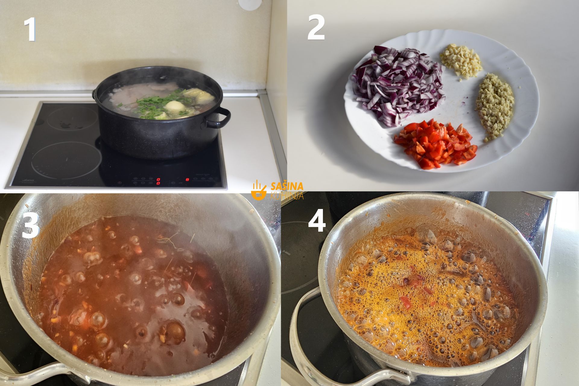 - Zakuhati 4-5 litara vode pa dodati teleća rebra. Možete koristiti i juneća rebra. Dodati i kupus, mrkvu, korjenasto povrće celer i peršin, luk i sol. Ostaviti da se kuha 3 sata. Točne količine su navedene gore na vrhu stranice u popisu sastojaka i video receptu (piše: otvori za listu sastojaka)